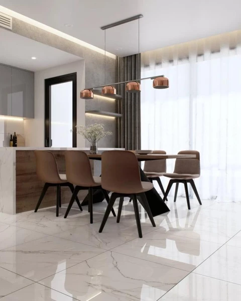 The polished finish delivers a high-gloss sheen that enhances color depth and reflects light, adding a sense of luxury and visual movement. It provides a bold yet practical surface for floors and walls.